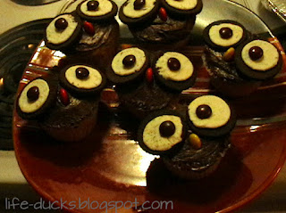 They baked wonderfully as well. I think out oven (we just moved to this house) is pretty darn amazing, or I am! When the cupcakes finally cooled, I got to town trying my best to get them to look like owls. I used half oreos and brown Reeses Pieces for the eyes, an orange Reeses Piece for the beak, and, of course, chocolate icing to make it all stick. I was so proud of the finished product!