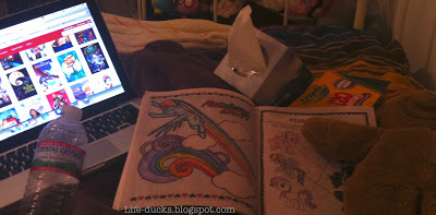 - While watching your guilty pleasures and between naps, colour! Yes, with crayons and a colouring book. Concentrating on something other than how pitiful you feel will help. Scouts honour. Bonus points if you keep a stuffed friend near by (they can't catch your germs!)